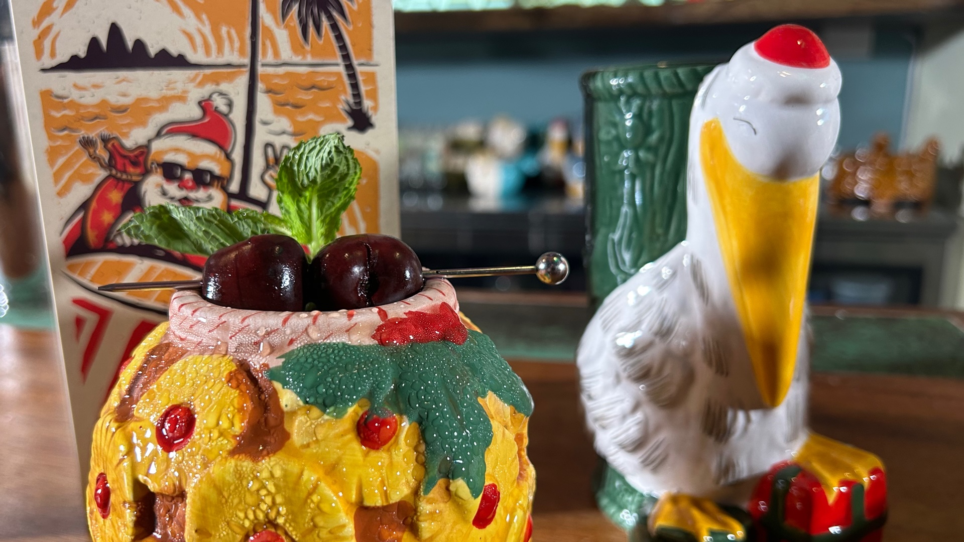 - Collectible tiki mugs wrapped like Christmas presents.