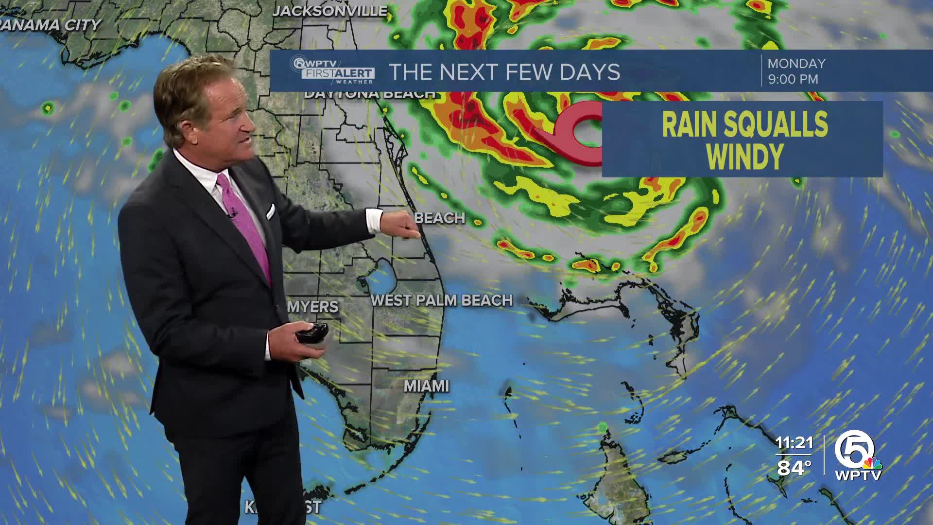 The watch means tropical storm-force winds are possible within 48 hours. Forecast guidance keeps the system offshore of Florida, but its proximity will bring deteriorating weather conditions along the coast.