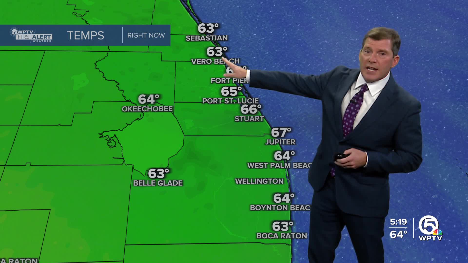 WEST PALM BEACH, Fla. — Tonight won’t be quite as cold, but it will still be chilly, with lows dipping into the 40s across interior areas west and south of Lake Okeechobee and closer to 50 degrees near the coast.