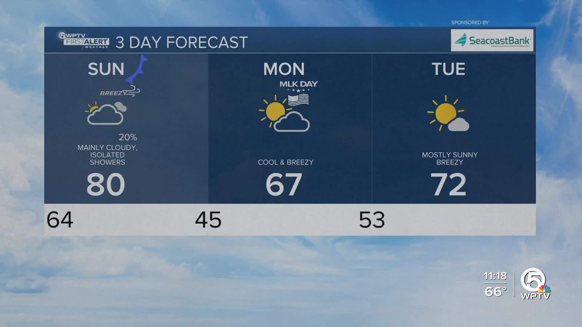 By early Monday morning, temperatures will drop into the mid 30s west of Lake Okeechobee, with low to middle 40s to lower 50s along the Treasure Coast and Palm Beaches.