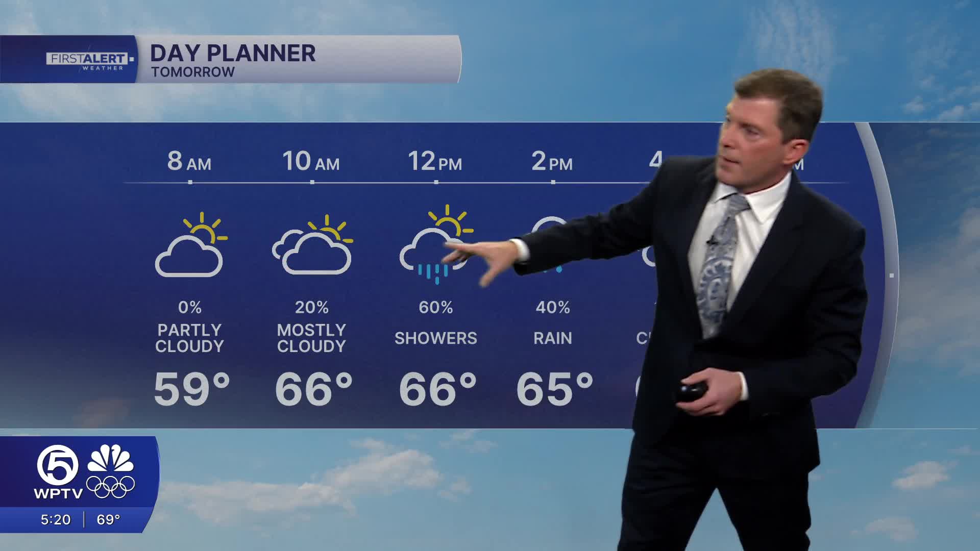 The front moves in Thursday, bringing a chance for a few passing showers. Rainfall looks light and spotty, with the highest accumulations near a 1/2 inch. No thunderstorms are expected. It will get breezy with occasional gusts up to 30 mph.