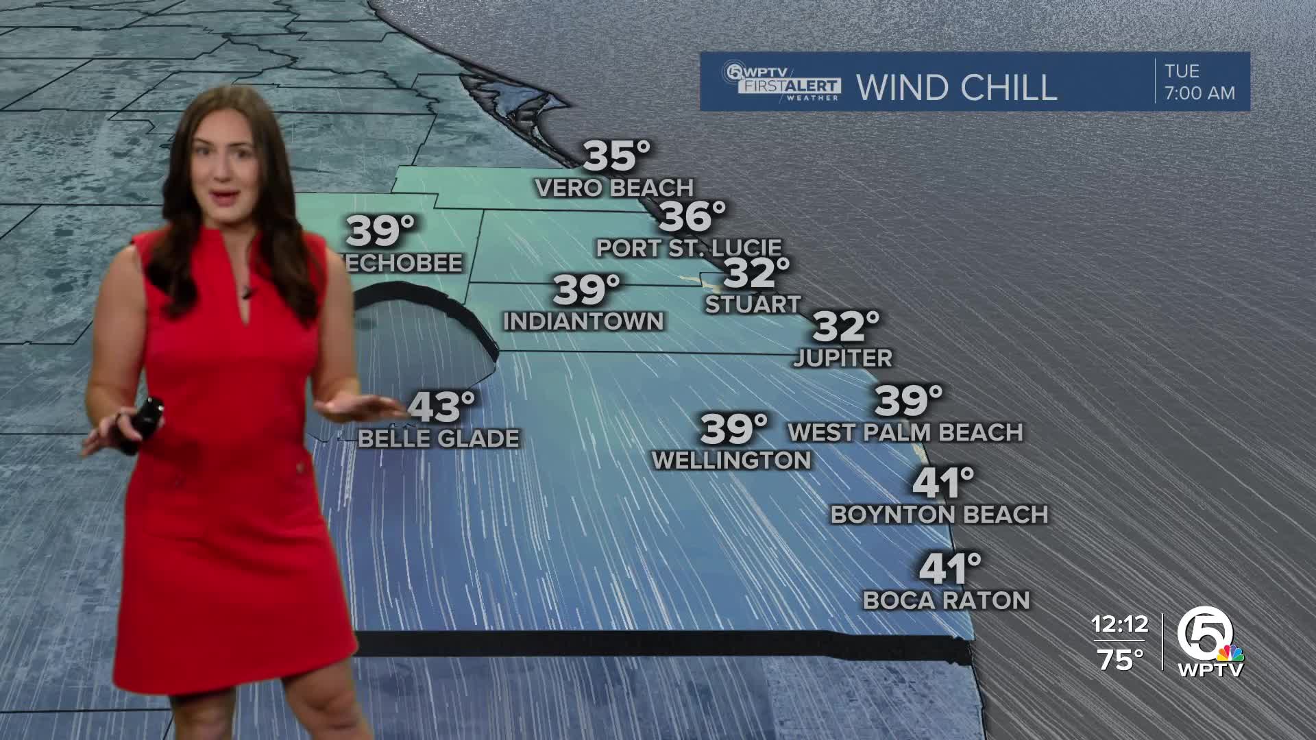 Inland spots could briefly dip near 40, while coastal areas may stay closer to the middle 40s. Wind chills could make it feel like the middle to upper 30s early Tuesday morning.