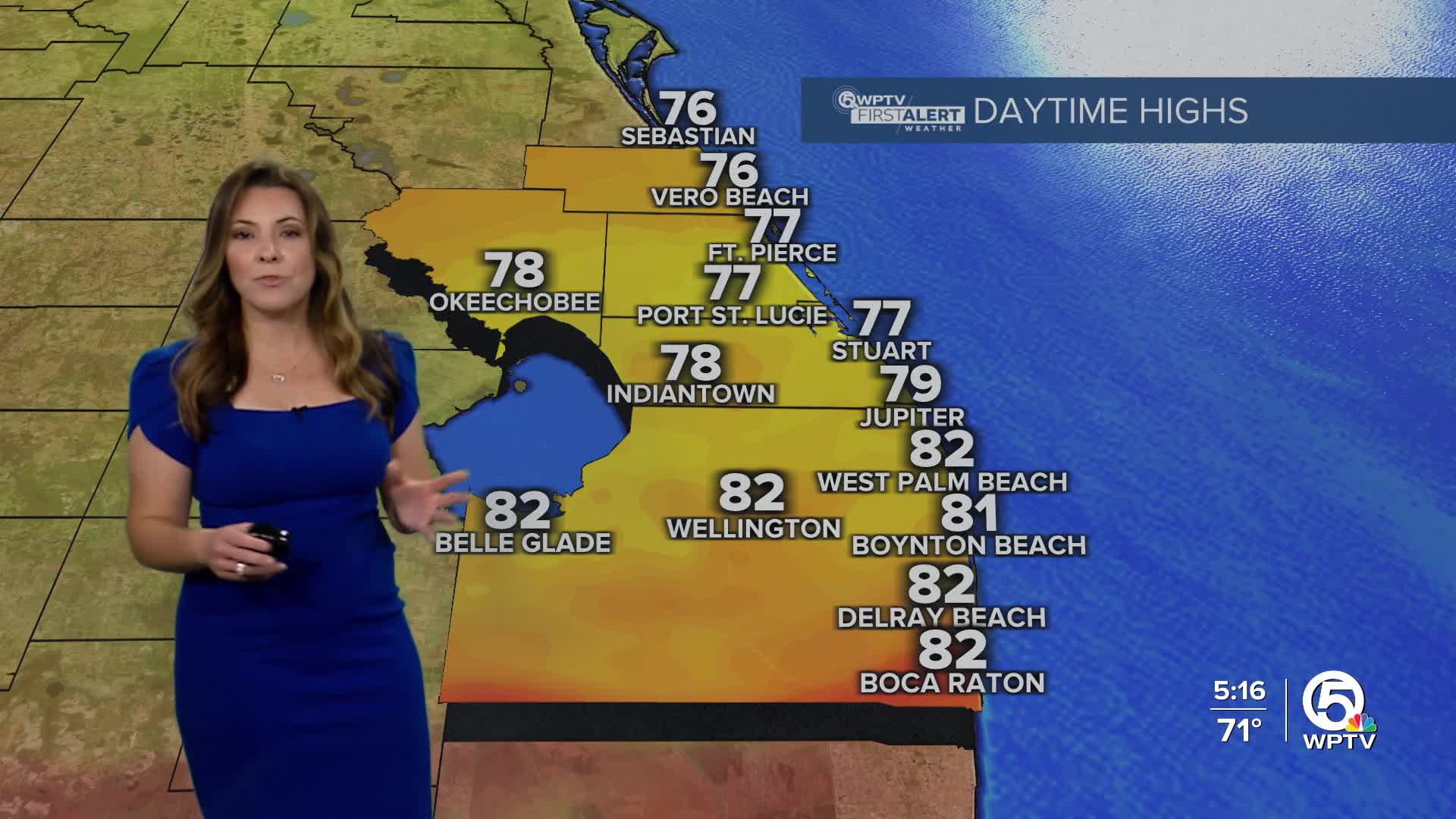 Tuesday's high temperatures will range from the upper 70s for the Treasure Coast and Okeechobee to low 80s for Palm Beach County.