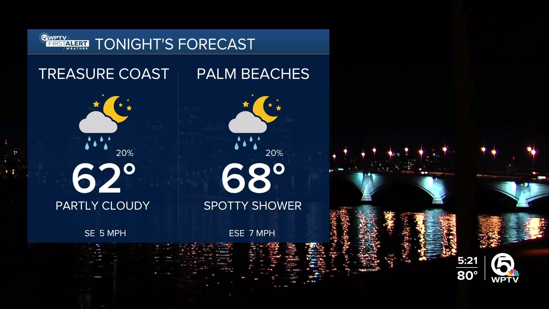 WEST PALM BEACH, Fla. — More patchy fog is expected late tonight into early Friday morning, mainly across interior areas. Along the coast, there will be a chance for a few spotty showers coming ashore overnight through the early morning.