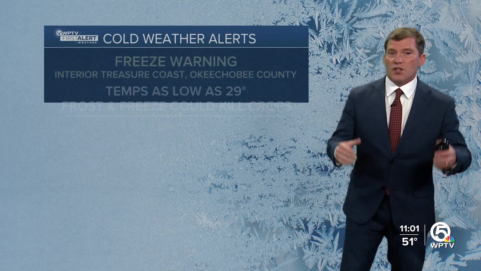A Freeze Warning has been issued for inland St. Lucie and Indian River counties, as well as Okeechobee County from 1 a.m. to 9 a.m. Friday. Frost and freeze conditions could kill crops, and wind chill could be hazardous for those without adequate warmth.