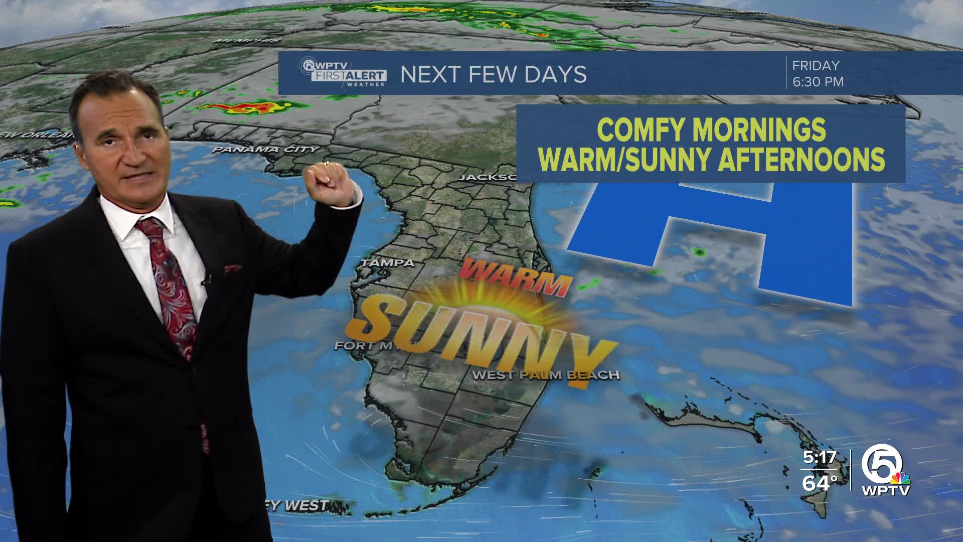 WEST PALM BEACH, Fla. — A gorgeous stretch of weather continues for South Florida with mainly sunny and pleasant conditions holding steady through the week. If you’re up early, you might encounter a little patchy fog—mainly across inland areas—but it won’t linger long. Once the sun rises, clear skies and comfortable warmth prevail.