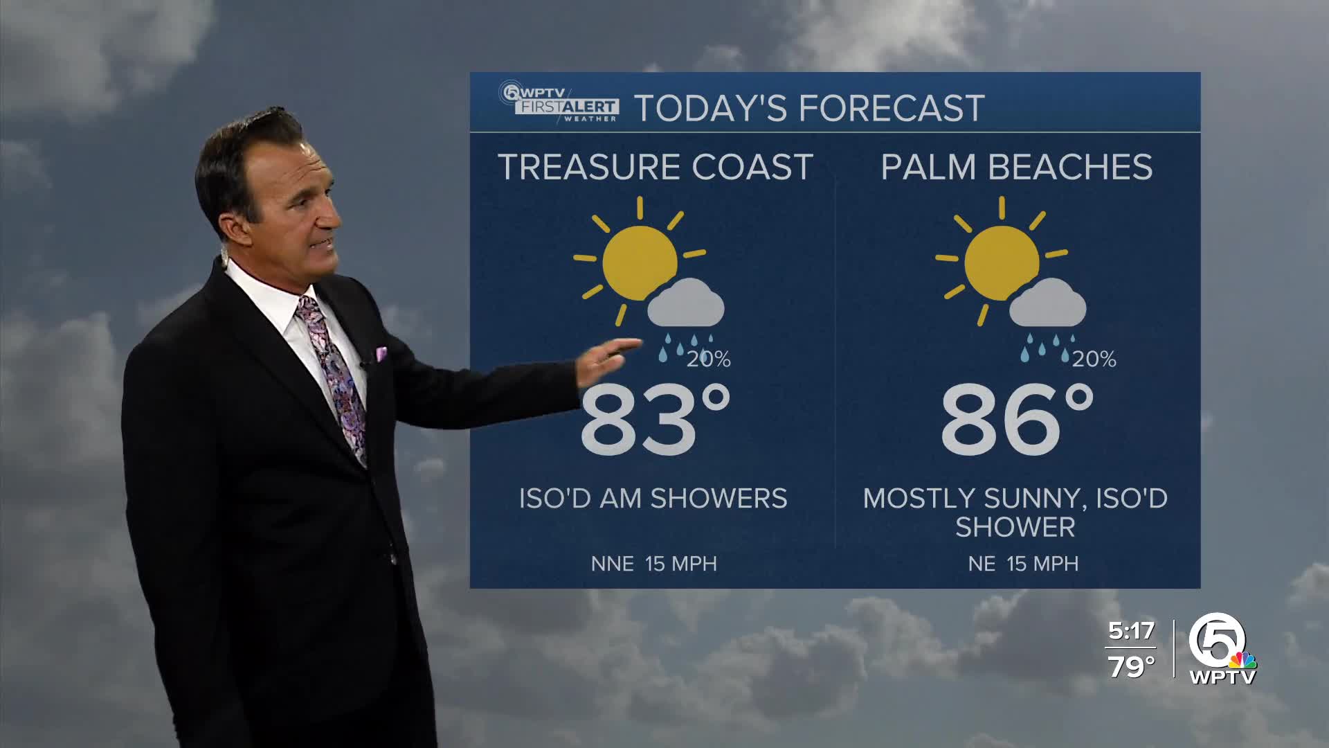 WEST PALM BEACH, Fla. — A weakening front will sweep into the area today, bringing in northeasterly winds of about 15-20 mph. Gusts will reach 25 mph along the coast late in the day. While a stray shower or two is possible, the main effect of the front will be the winds.