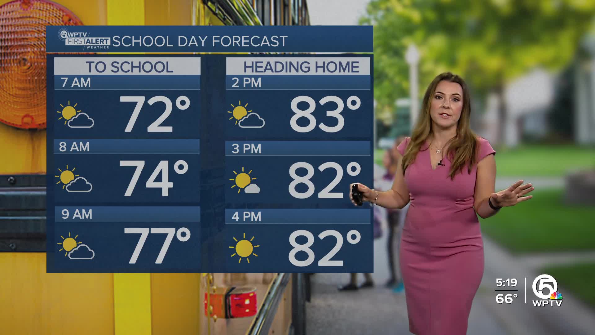 WEST PALM BEACH, Fla. — Friday morning will bring some patchy fog, mainly across the interior and parts of the Treasure Coast, so take it slow on the roads if you’re out early. Once that dissipates, we’re back to the warm, quiet pattern. Highs in the low to mid-80s, sunshine, and a south breeze up to 15 mph.