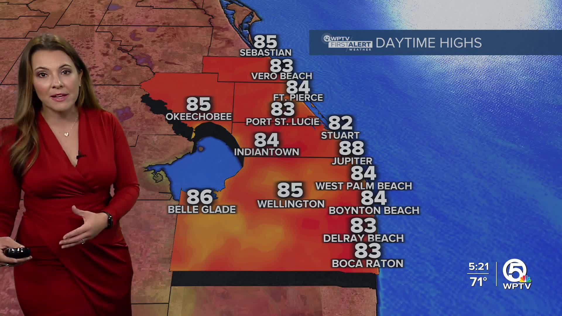 Anticipate a chilly Friday morning with lows in the upper 50s, with some upper 40s possible north of Lake Okeechobee. A brisk wind will keep highs in the upper 60s to lower 70s on Friday afternoon.