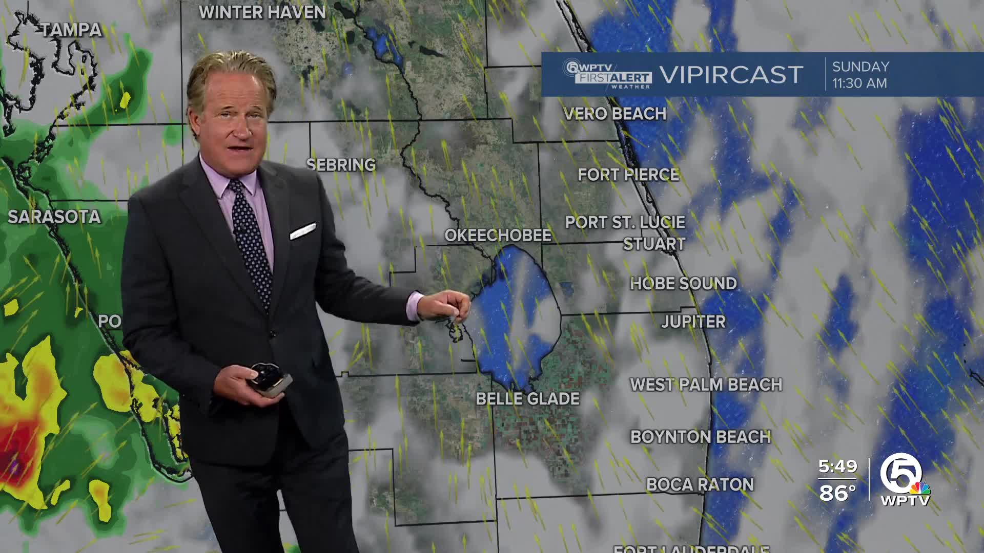 WEST PALM BEACH, Fla. — The rain is expected to become more scattered overnight through the early morning, with storms developing offshore and rolling into the coast. Lows will fall into the mid-upper 70s.