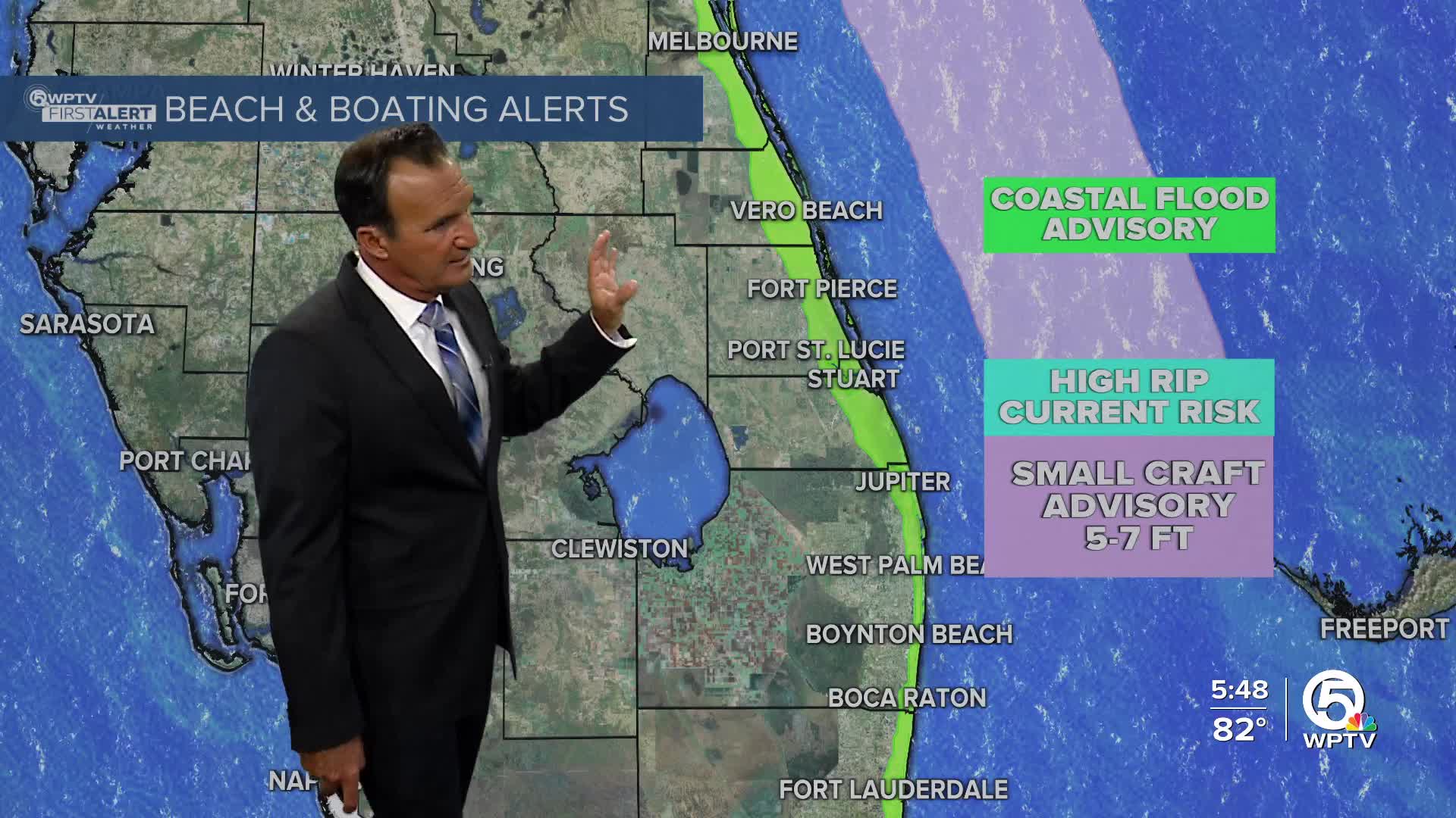 At the beach and marine areas, conditions remain dangerous — expect coastal flooding around high tide, life-threatening rip currents, rough surf, and minor to moderate beach erosion. A Coastal Flood Advisory is in effect, and while the High Surf Advisory will expire at 5 p.m., hazards will continue.