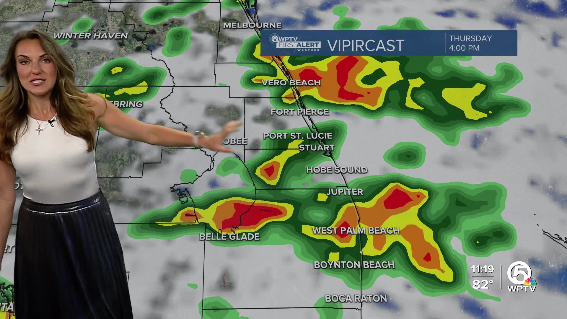 WEST PALM BEACH, Fla. — Thursday and Friday bring higher rain chances as a cold front moves into Florida. Moisture increases, and rain chances jump to 40–70% with more widespread showers and storms, especially along the coast. A few areas could see locally heavy rain.