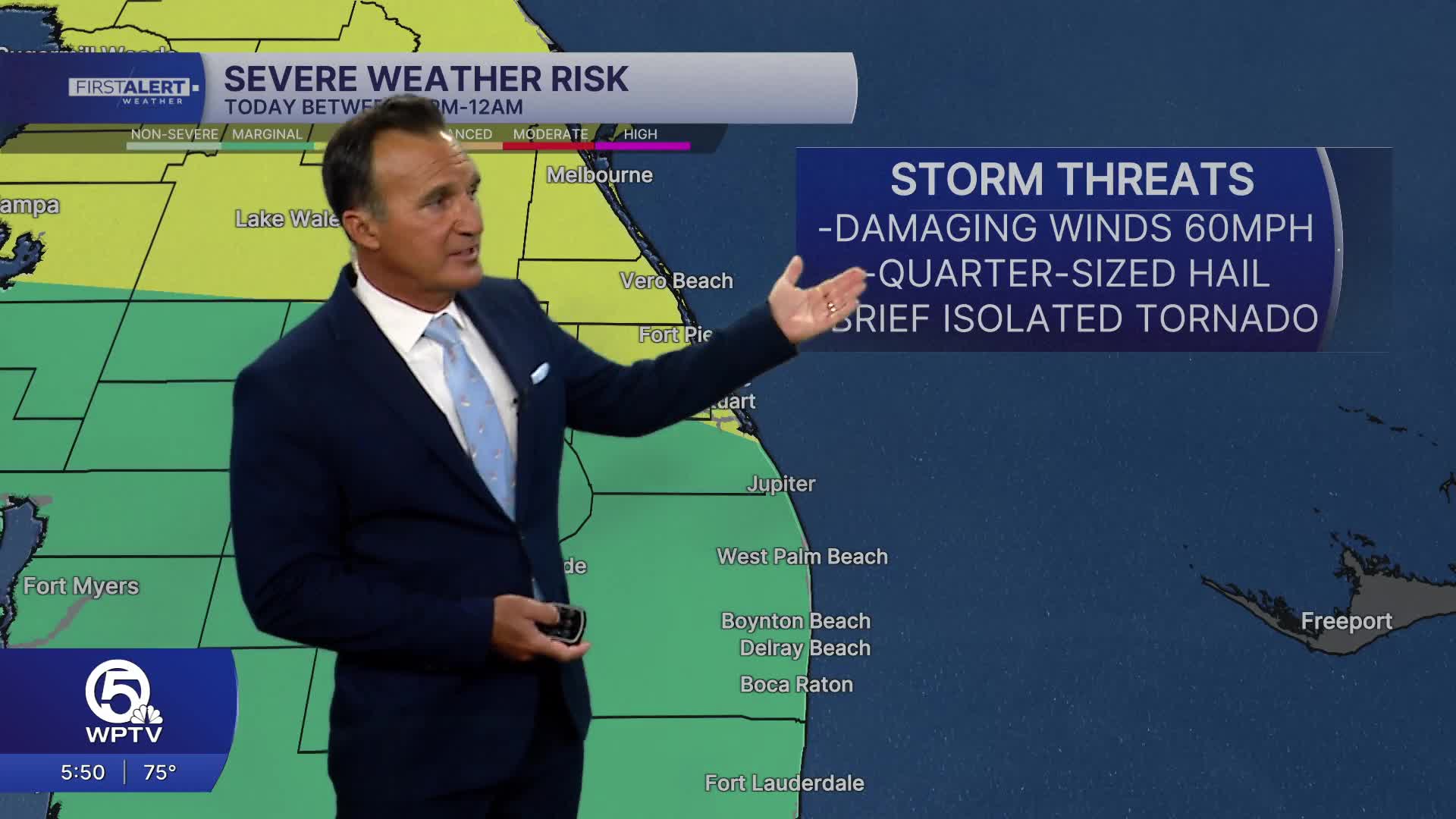 There’s a Level 2 Slight Risk for strong to severe storms from 1 p.m. to 10 p.m. as a cold front pushes toward the Treasure Coast, then through South Florida.