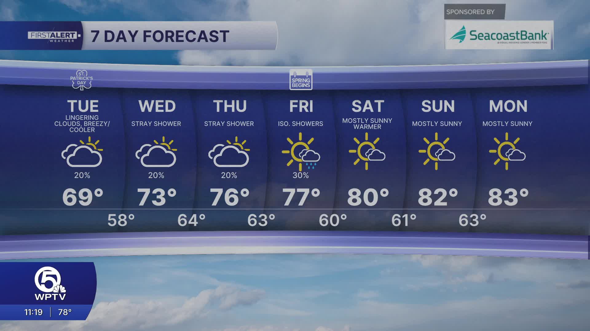 A few showers are possible Tuesday morning as the front pushes out of Palm Beach County. Cloudy skies linger the rest of the day. Afternoon highs on Tuesday will be nearly 20 degrees cooler than Monday, topping out mainly in the 60s.