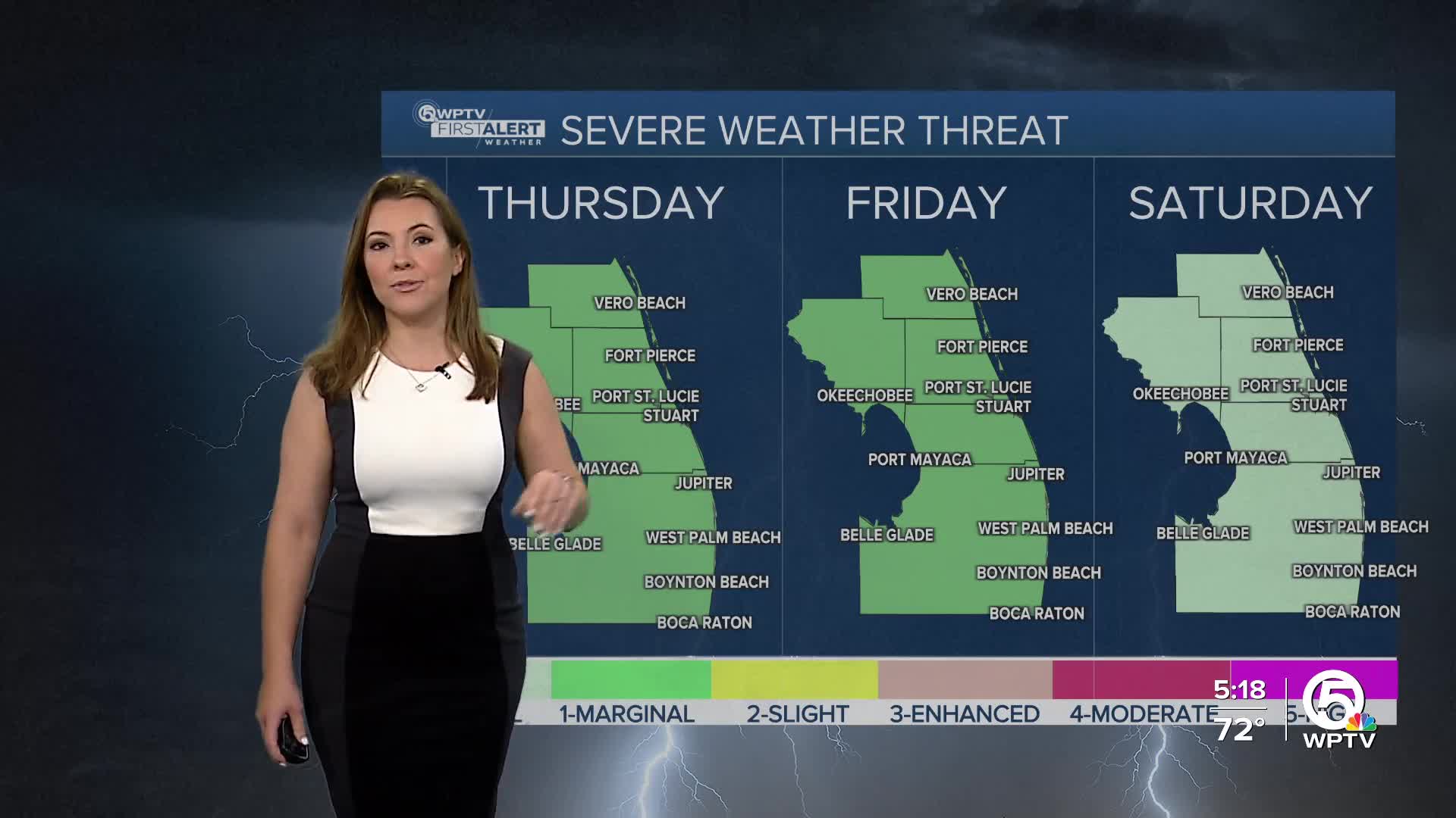 Once again tomorrow, our entire viewing area is under a Level 1 Marginal risk for severe weather. Along with strong wind gusts and heavy downpours, isolated storms could have damaging winds and produce localized flooding in slow-moving storms and poor drainage areas. The tornado threat is low, but can't be ruled out.