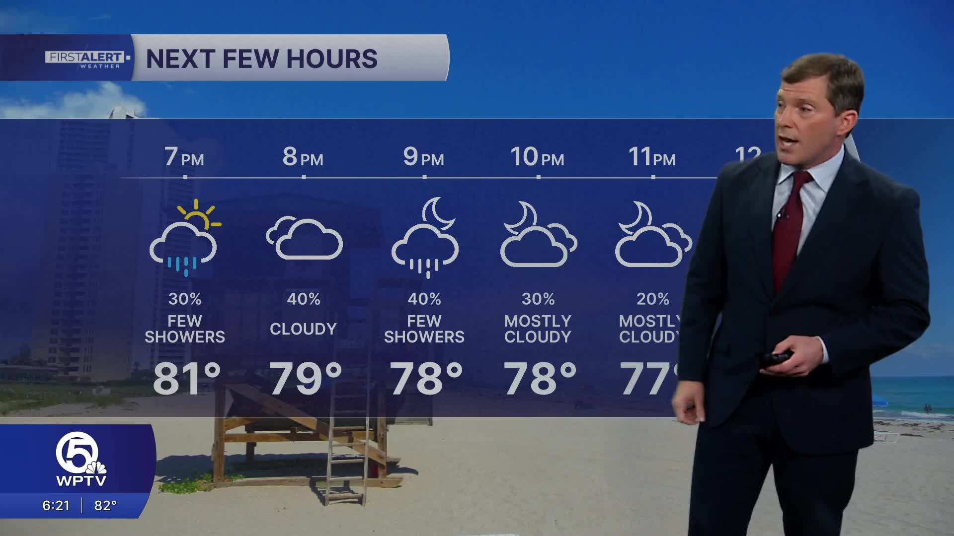 WEST PALM BEACH, Fla. — Rain chances are increasing across the Treasure Coast and Palm Beaches as a weak front and several disturbances approach Florida. While the pattern will bring more clouds and scattered showers through the next several days, temperatures will remain warmer than normal for mid-March.