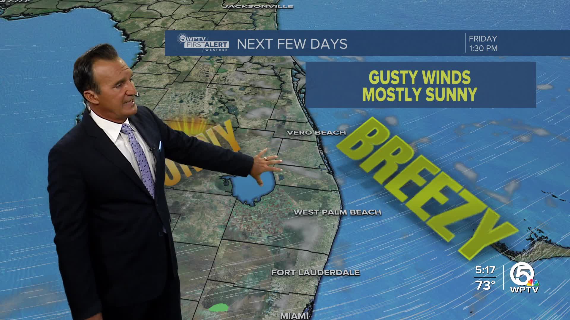 The combination of these gusty winds and a new moon could lead to minor flooding around high tide along South Florida's east coast—especially within about two hours of high tide. While the weather has been quite pleasant this morning, we could see some quick-moving showers along the coast. Expect temperatures in the mid-80s.