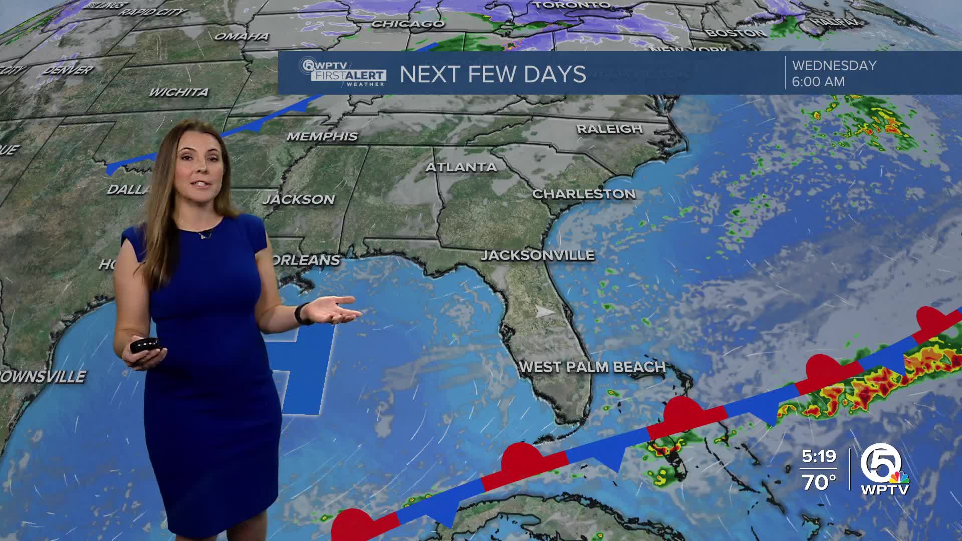 This morning begins with plenty of clouds as a weak front lingers over the Florida Straits. Northerly winds behind the front have brought in much drier air, which will keep rain chances low, although the clouds will stick around until late morning or early afternoon. Skies will gradually clear later today, and afternoon temperatures will feel slightly warmer, reaching the mid-70s to low 80s.