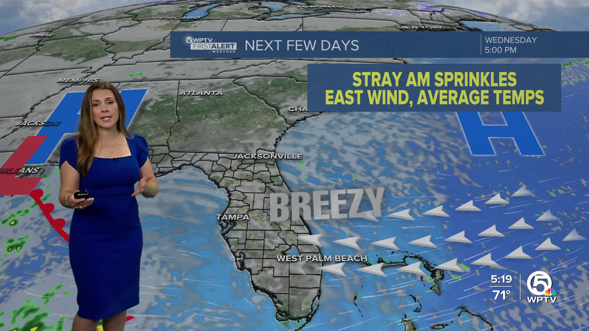 WEST PALM BEACH, Fla. — South Florida and the Treasure Coast will stay mostly dry today, with only a slight chance of a brief shower along the east coast during the early part of the day.