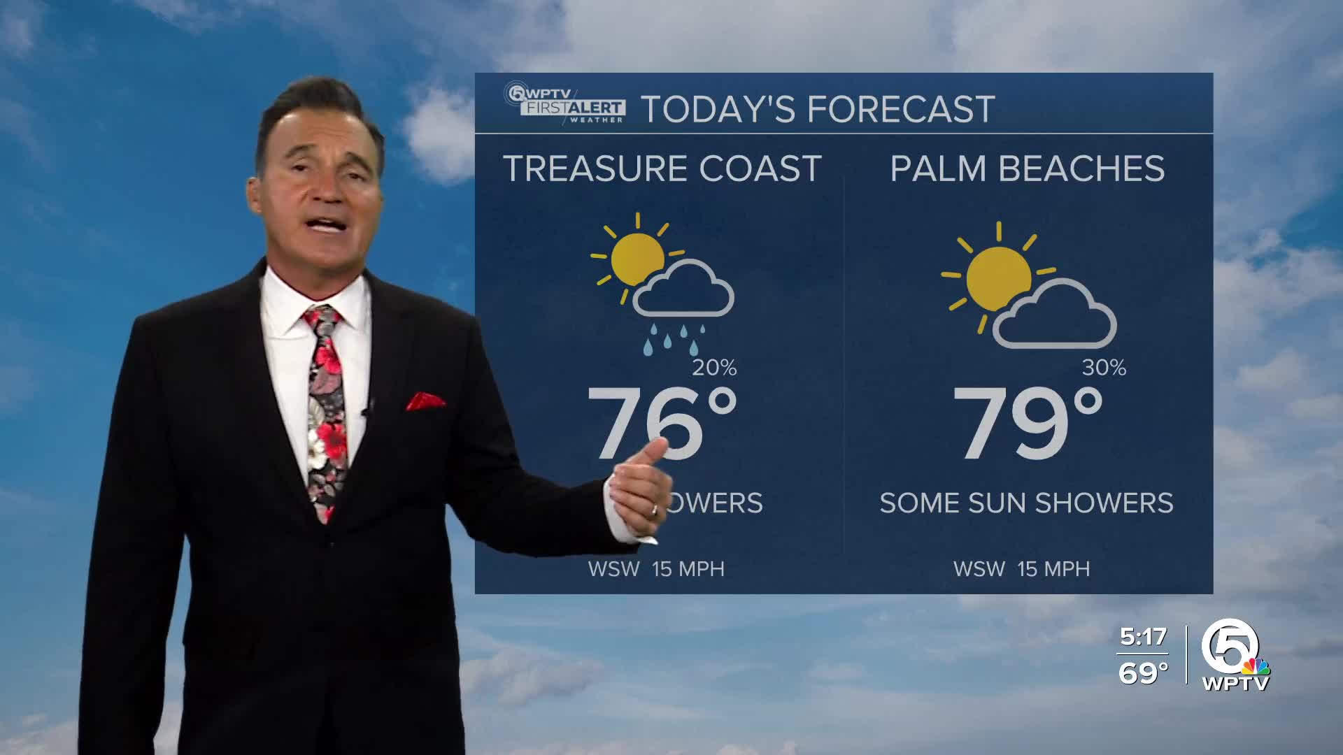 Expect sunshine to break through the clouds this afternoon as a boundary will keep slim rain chances in today's forecast. Most of the rain is expected to occur offshore in the morning. This afternoon, showers will be light and isolated. Highs today will reach the mid-to-upper 70s.