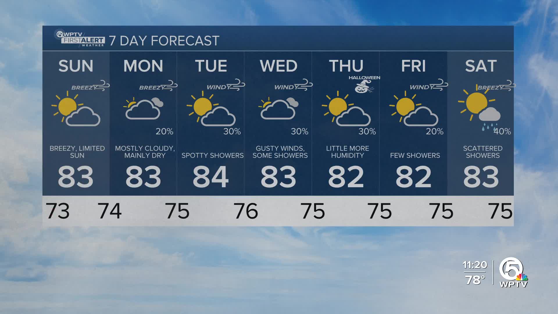 WEST PALM BEACH, Fla. — High pressure in control of our weather will give us a dry day for Sunday with nothing more than an isolated stray showers.