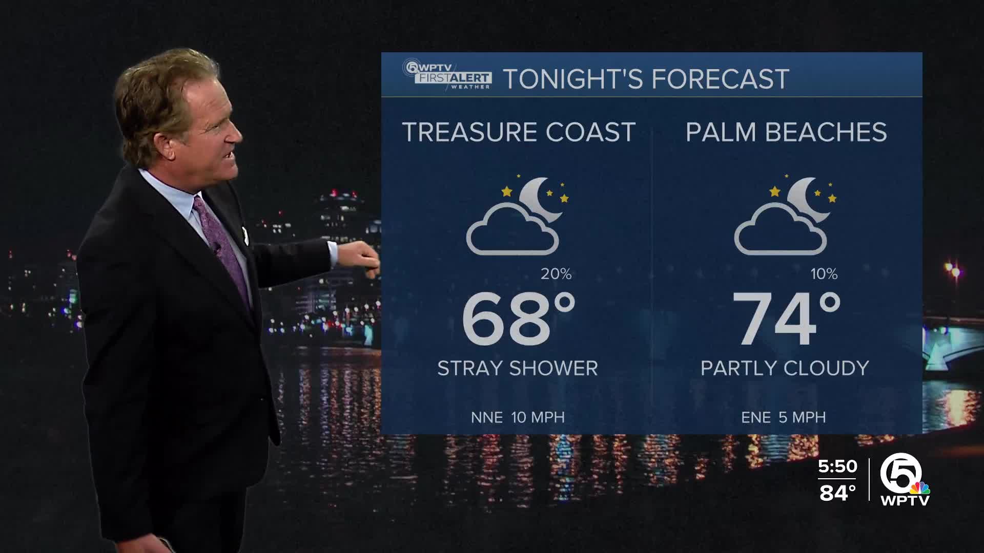 WEST PALM BEACH, Fla. — A stray shower or two is possible late tonight and through Thursday morning, especially in the Treasure Coast and around Lake Okeechobee. Lows will cool down into the 70s overnight.