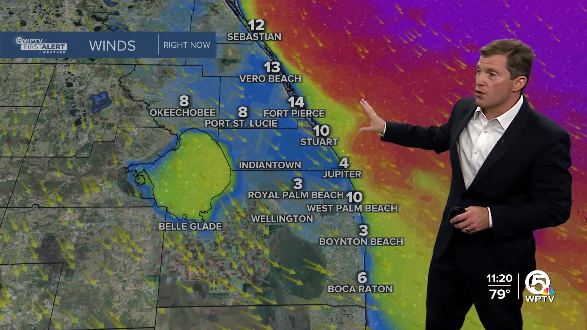 Winds across land are not forecast to reach tropical storm force, but breezy conditions are expected. North to northwest winds 20-30 mph are expected for the Treasure Coast, and gusts up to 40 mph are possible.