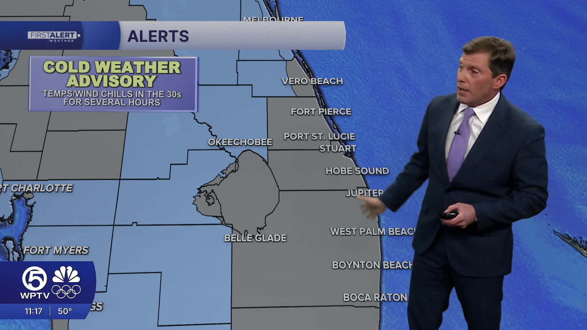 A cold weather advisory is in effect for western Indian River County and Okeechobee through Wednesday morning and a freeze watch is in effect for Okeechobee County for Wednesday night.
