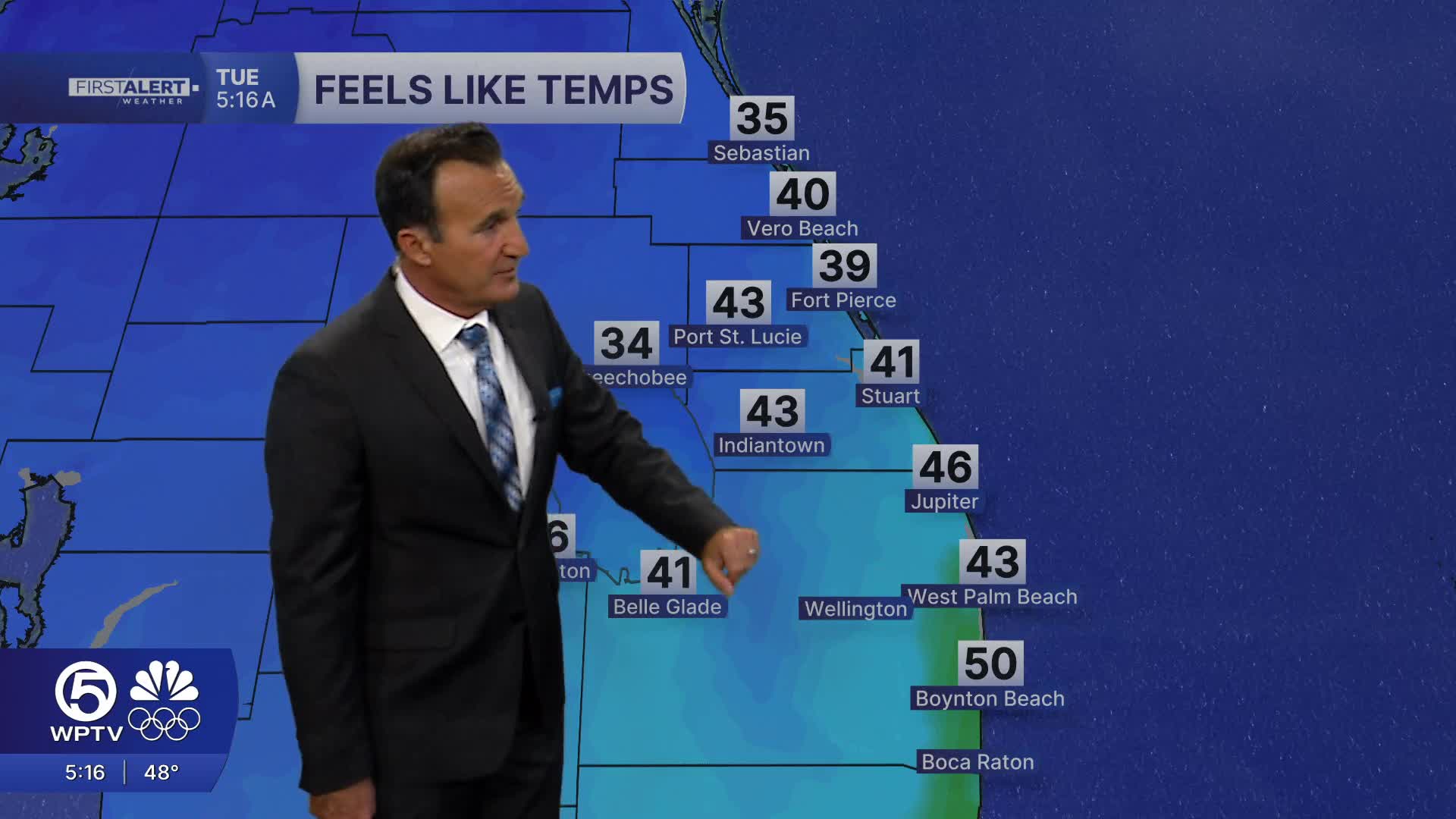 WEST PALM BEACH, Fla. — A strong northerly wind is bringing the cold across Florida, with temperatures this morning in the low 40s on the Treasure Coast and low 50s in the Palm Beaches. The wind chill is making it feel about five degrees cooler.