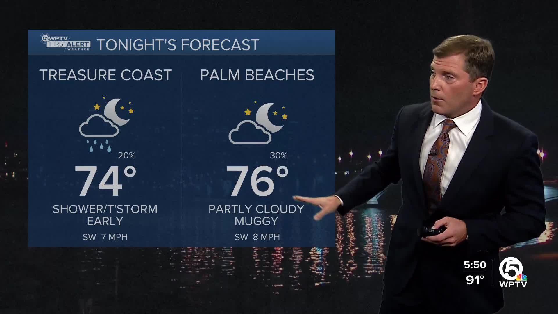 WEST PALM BEACH, Fla. — An approaching cold front to the north will slam on the brakes just north of the WPTV television market this week. Places like Gainesville, Tallahassee, Jacksonville and Orlando will enjoy fall-like humidity levels for a couple of days. But that should be the extent of the southern push of dry air. Not much relief expected for south Florida.