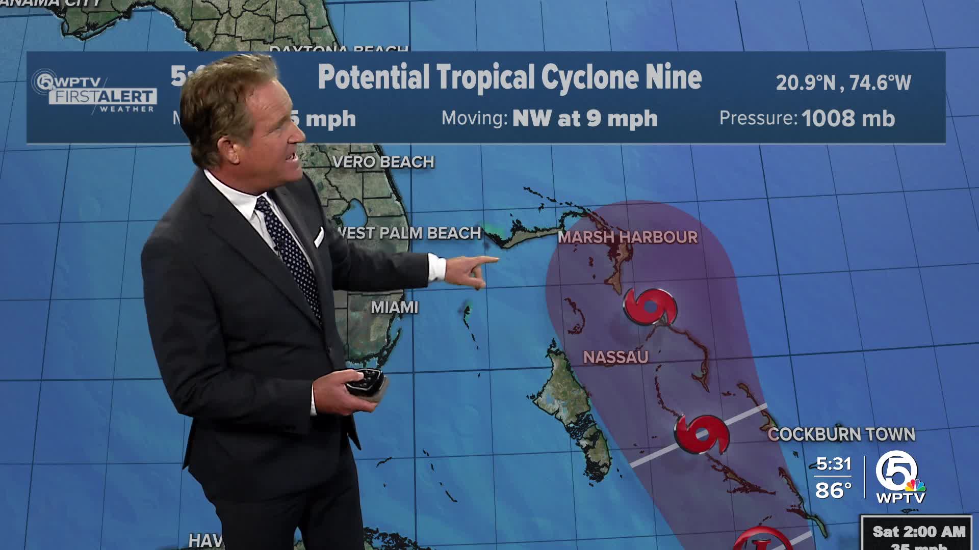 The system is moving toward the southeastern Bahamas, with a good chance that it will become a tropical depression soon.
