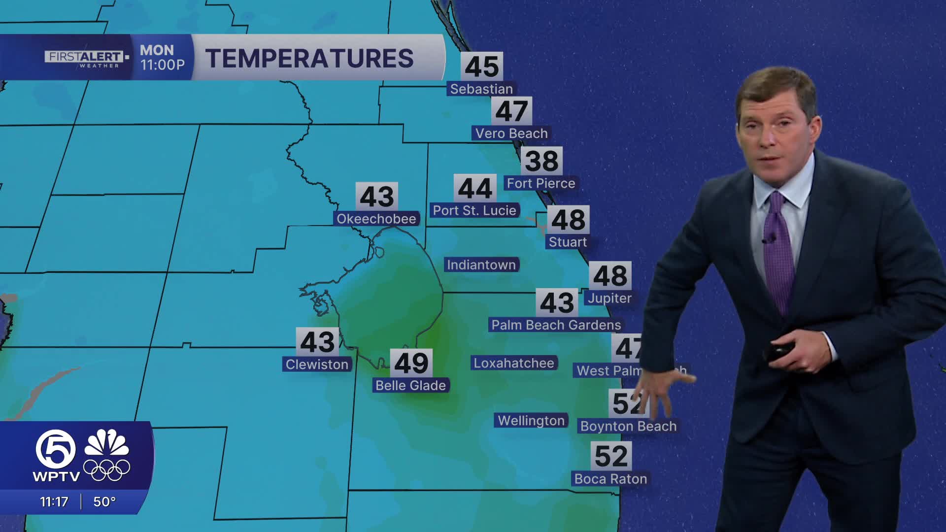 WEST PALM BEACH, Fla. — A blast of colder, much drier air has settled in behind a cold front, sending temperatures tumbling into the 30s and 40s, with wind chills dipping into the 20s in some spots.