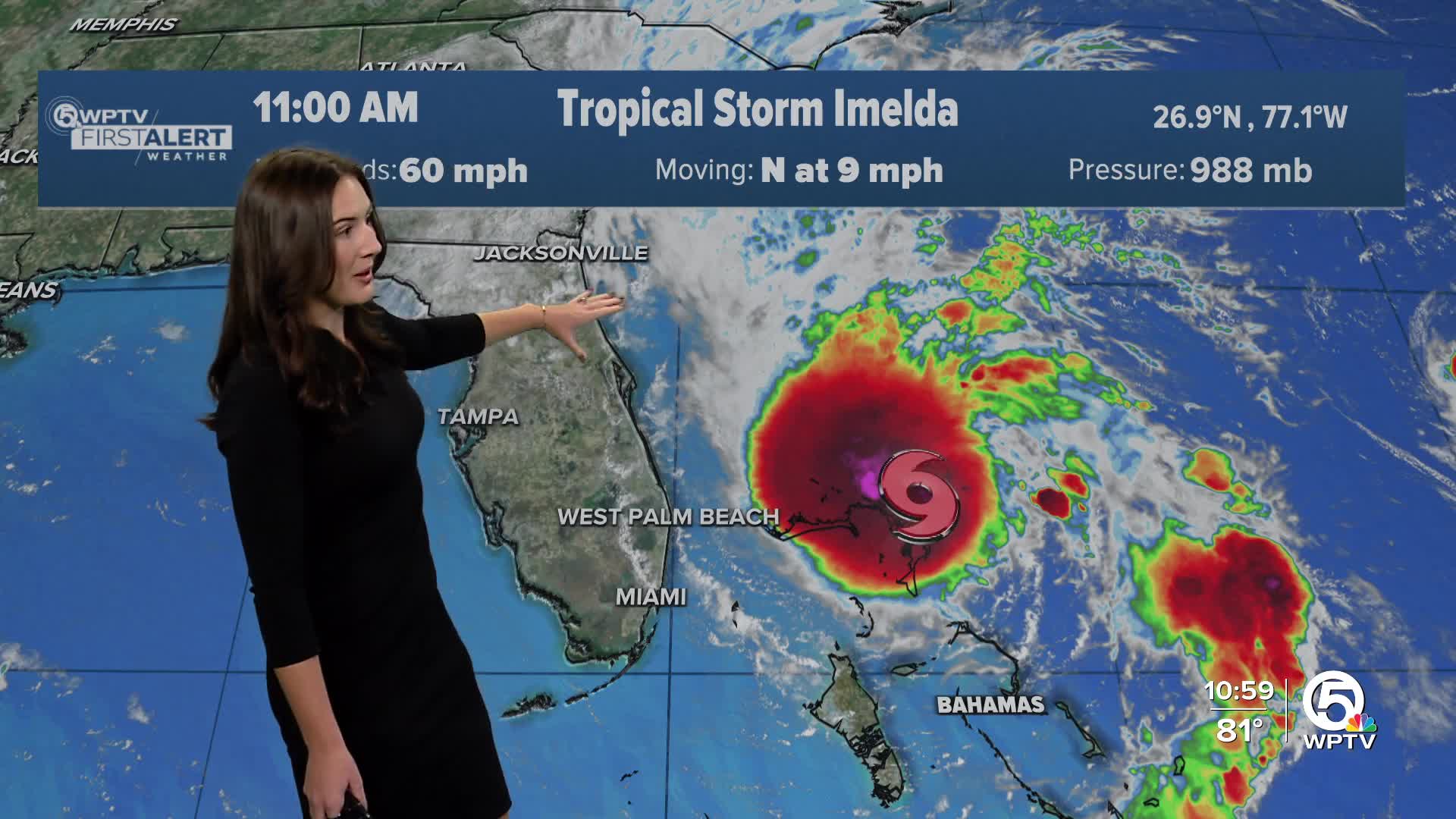 WEST PALM BEACH, Fla. — Tropical Storm Imelda is continuing to move north on Monday and is currently located about 35 miles north of Great Abaco Island. The storm is moving at 9 mph and is sustaining maximum winds of 60 mph.