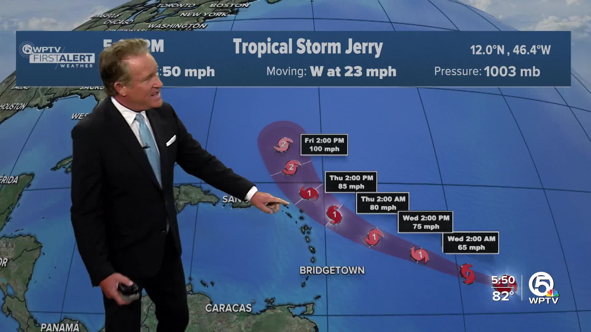 Steady strengthening is forecast, and Jerry is expected to become a hurricane in a day or two.