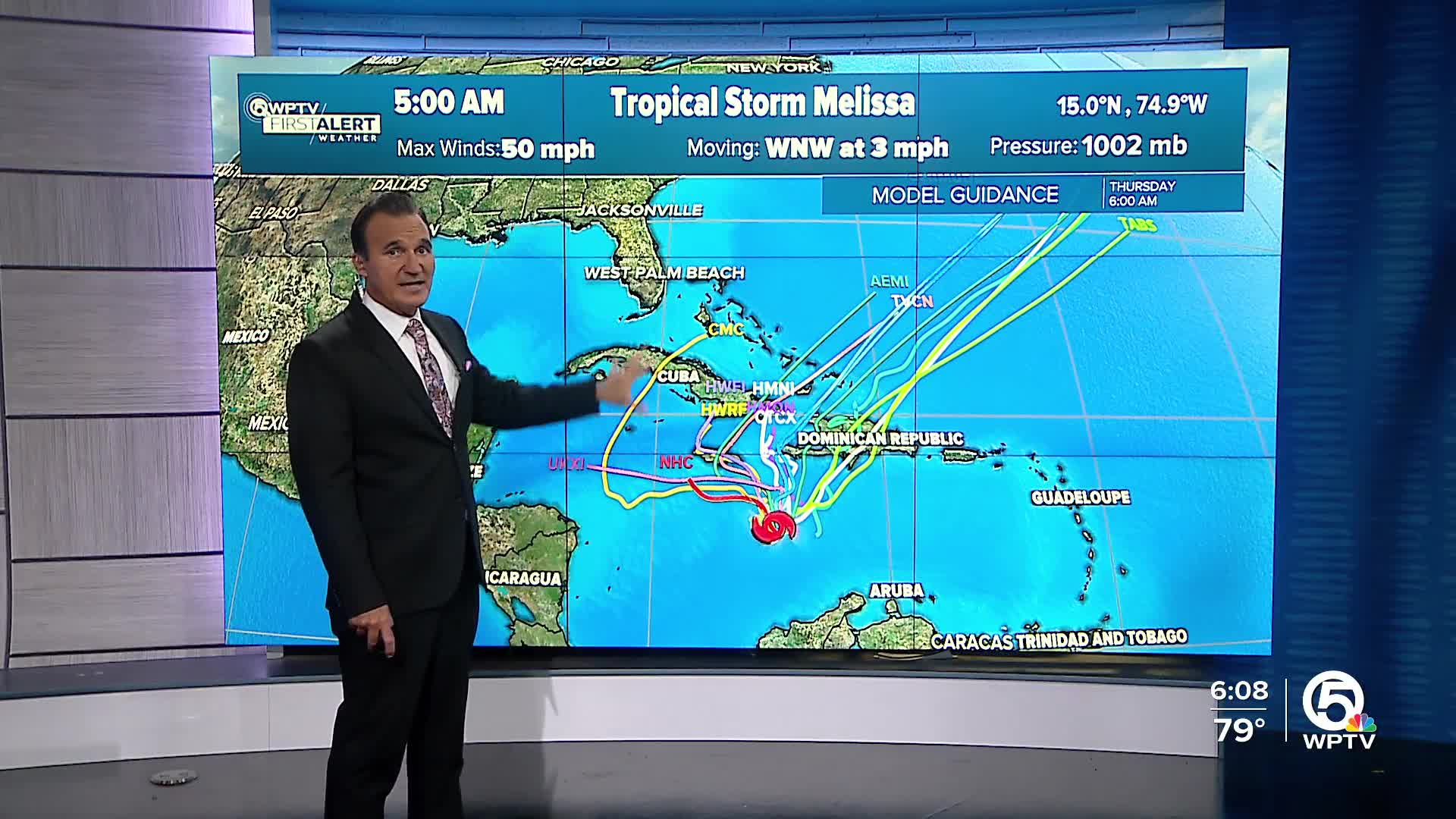 WEST PALM BEACH, Fla. — Tropical Storm Melissa is crawling over the central Caribbean Sea, sustaining winds of 50 mph and moving northwest near 5 mph.