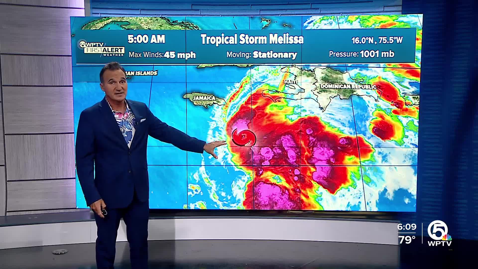 WEST PALM BEACH, Fla. — Tropical Storm Melissa is showing signs of becoming a bit more organized. However, current data indicate that the storm's structure is still not quite aligned, and its overall circulation is poorly defined.