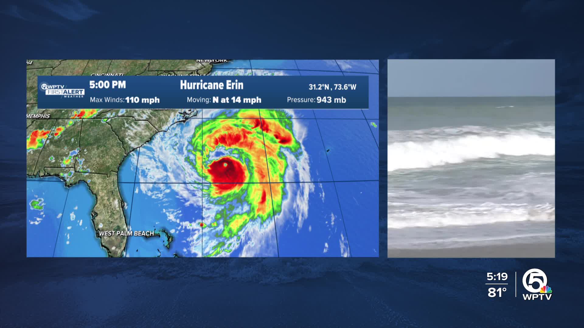 WEST PALM BEACH, Fla. — Hurricane Erin is continuing to travel north as a Category 2 storm with max sustained winds at 110 mph. This will bring it close enough to the Outer Banks and Bermuda to prompt tropical storm warnings and storm surge warnings.