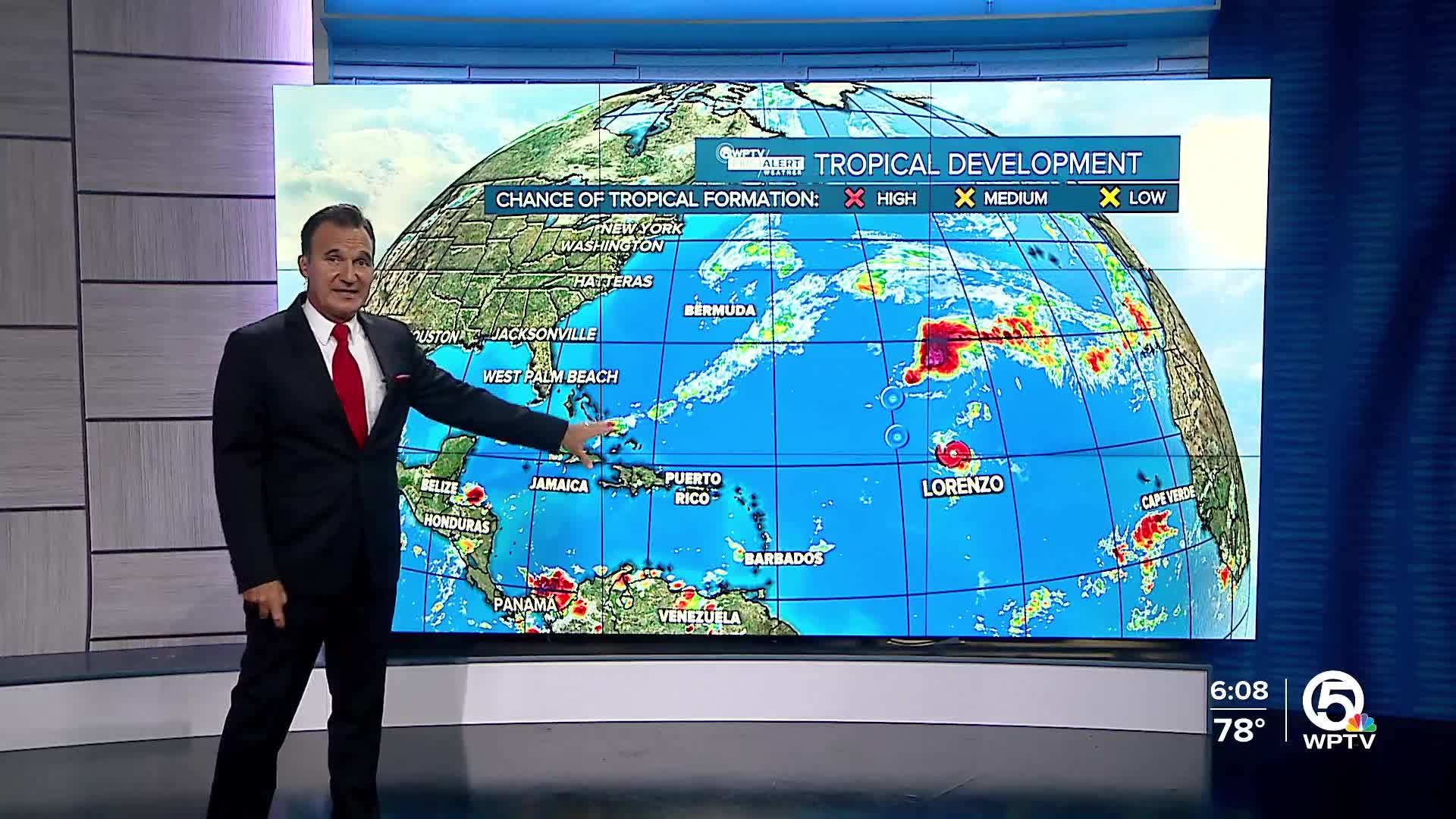 WEST PALM BEACH, Fla. — Lorenzo is currently facing challenges with its convective organization as it moves north-northwest at about 10 knots. While satellite images show a recent burst of convection near the center, this activity has been intermittent throughout the day. Current intensity estimates suggest that the storm is around 35 to 45 knots, but for now, it will be held at 35 knots.