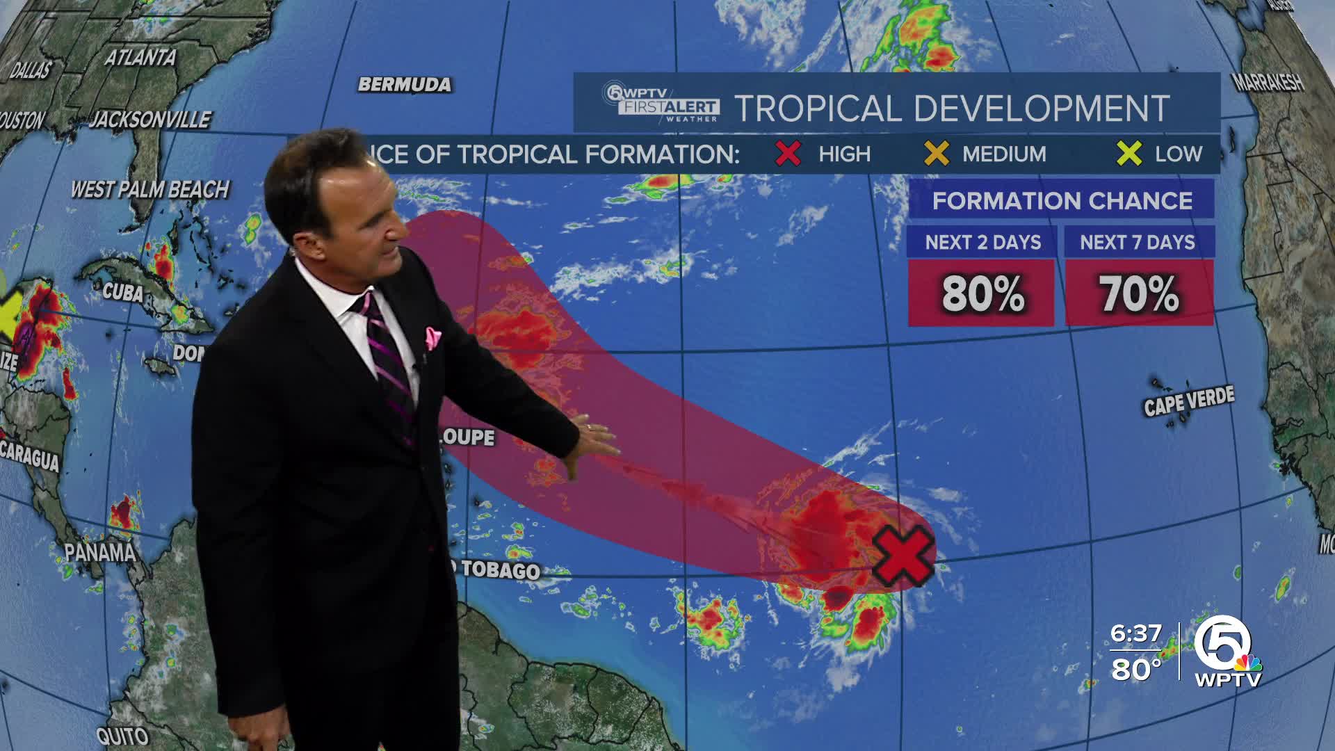 WEST PALM BEACH, Fla. — An area of low pressure, approximately 1,500 miles east of the Windward Islands, is becoming more organized, with satellite data indicating that it's strengthening. Conditions in the atmosphere are favorable for further development, and it’s likely this system will become a tropical depression—or possibly a tropical storm—within the next day or so.