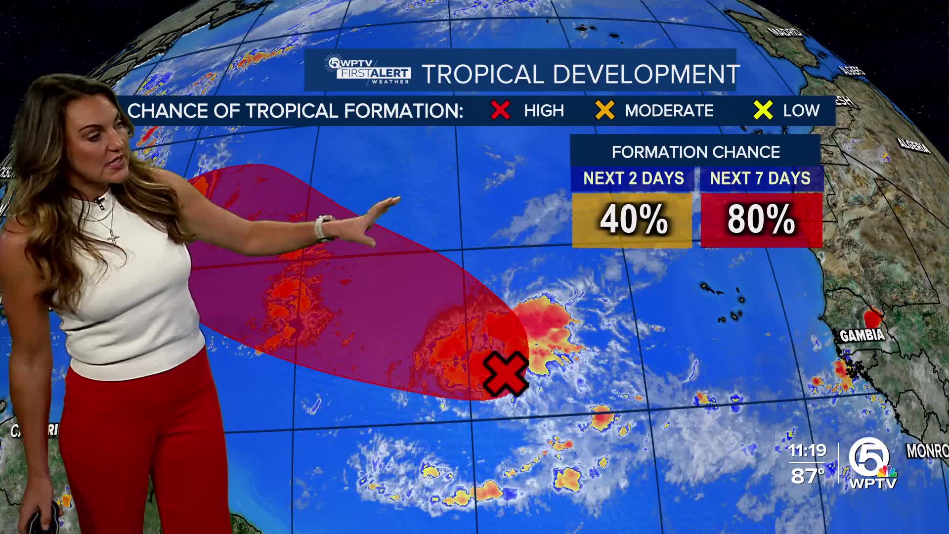 The system now has a 40% chance of development in the next two days and an 80% chance within the next seven days.