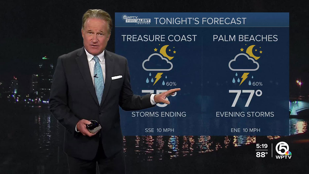 WEST PALM BEACH, Fla. — A few storms linger inland, but they are beginning to wind down for the night. Clouds will partially clear out. Overnight remains warm and muggy, with lows in the mid to upper 70s.