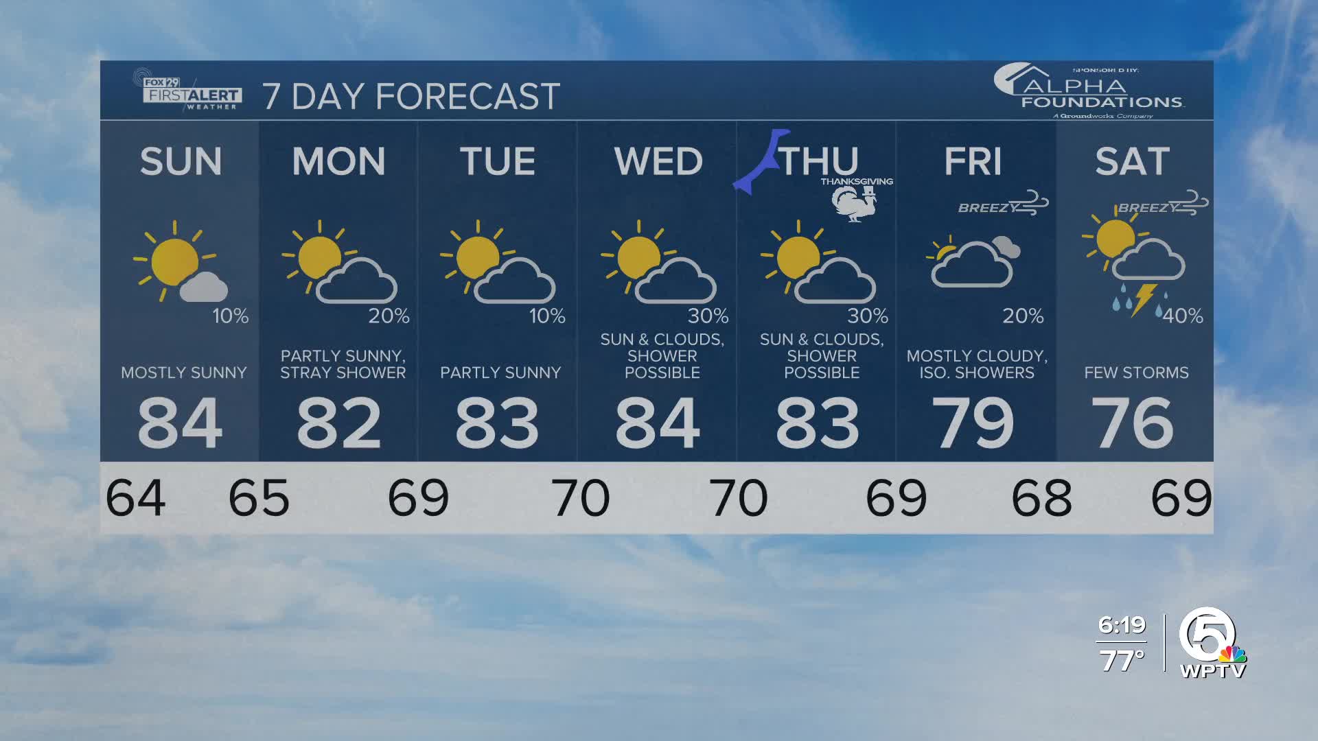 WEST PALM BEACH, Fla. — Tonight will be comfortably cool after the sun goes down. By morning, lows will fall into the upper 50s around the lake, near 60 along the Treasure Coast and the mid 60s for the Palm Beaches.